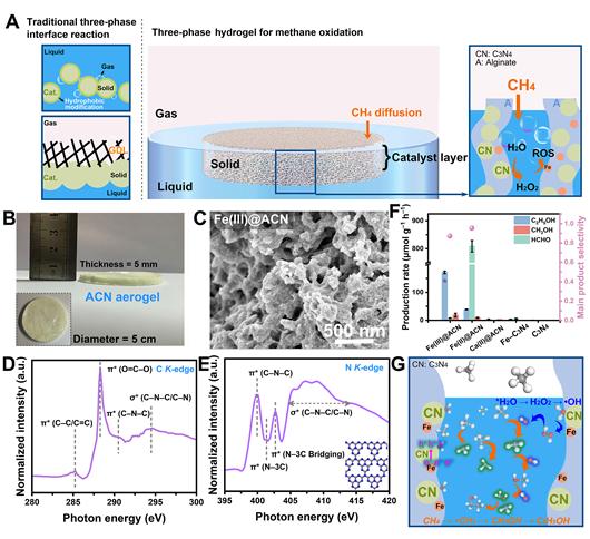 G. 用于CH4转化为C2H5OH的三相Fe(III)@ACN水凝胶膜示意图。