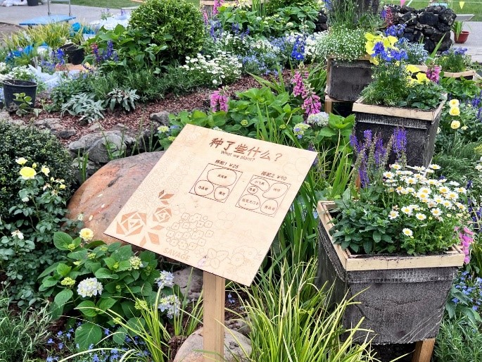 解决了容器的问题后,就进入了场地设计阶段。同学们开始思考如何将容器与场地进行融合:利用容易获取的木方进行支架制作,手工切割拼接,作为容器底座。同时,利用景观系先进的激光雕刻机,进行展示牌的制作,自然的木头焦化纹理为花园又增添了一番色彩。值得一提的是,场地所有容器和架子均为同学们利用专业工具手工制作完成,展现出高超的动手能力。