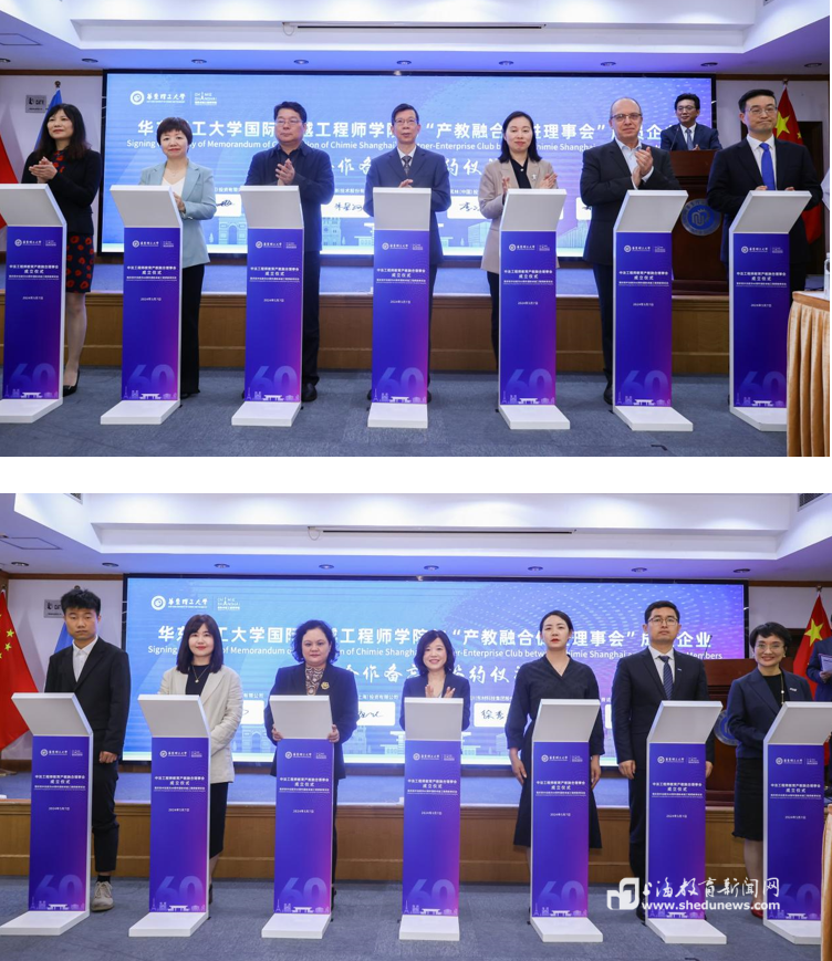 成立仪式上,Syensqo集团、阿科玛(中国)投资有限公司、圣戈班集团、米其林(中国)投资有限公司、液化空气(中国)投资有限公司、赛诺菲(中国)投资有限公司、苏伊士(上海)投资有限公司、巴斯夫新材料有限公司、江西恒大高新技术股份有限公司、上海和辉光电股份有限公司、四川东材科技集团股份有限公司、万华化学股份有限公司等中法两国相关企业共同签署了《华东理工大学国际卓越工程师学院与“产教融合促进理事会”成员企业合作备忘录》(以下简称《备忘录》)。Joan Valadou、叶霖霖、轩福贞、沈海涛和朱为宏一同为理事会揭牌。