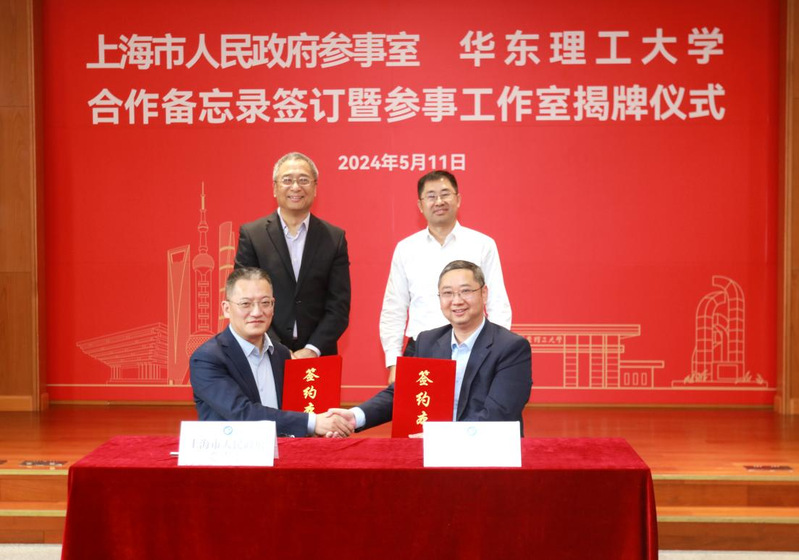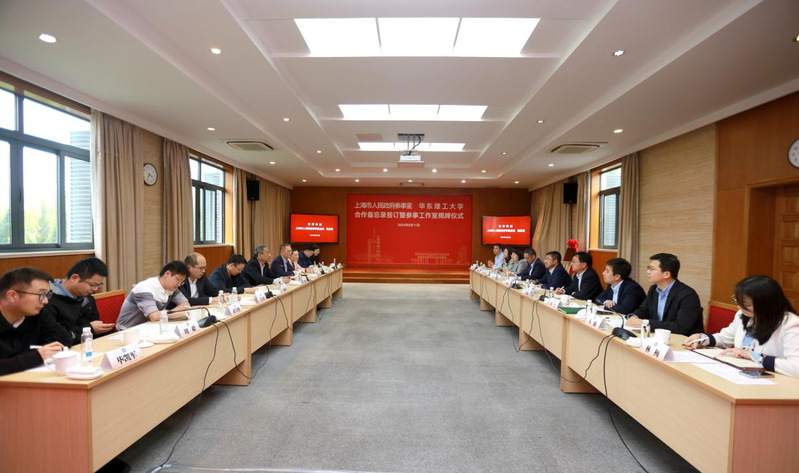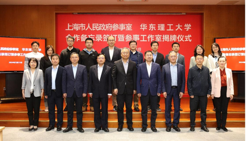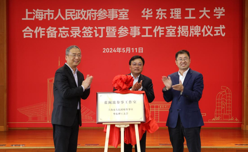 5月11日下午,上海市人民政府参事室(以下简称“市政府参事室”)与华东理工大学合作备忘录签订暨蓝闽波参事工作室揭牌仪式在徐汇校区举行。上海市政府参事室党组书记、主任莫负春,校党委书记蒋传海出席并讲话,市政府参事室副主任詹咏、市政府参事蓝闽波等参加。仪式由校党委副书记宋来主持。