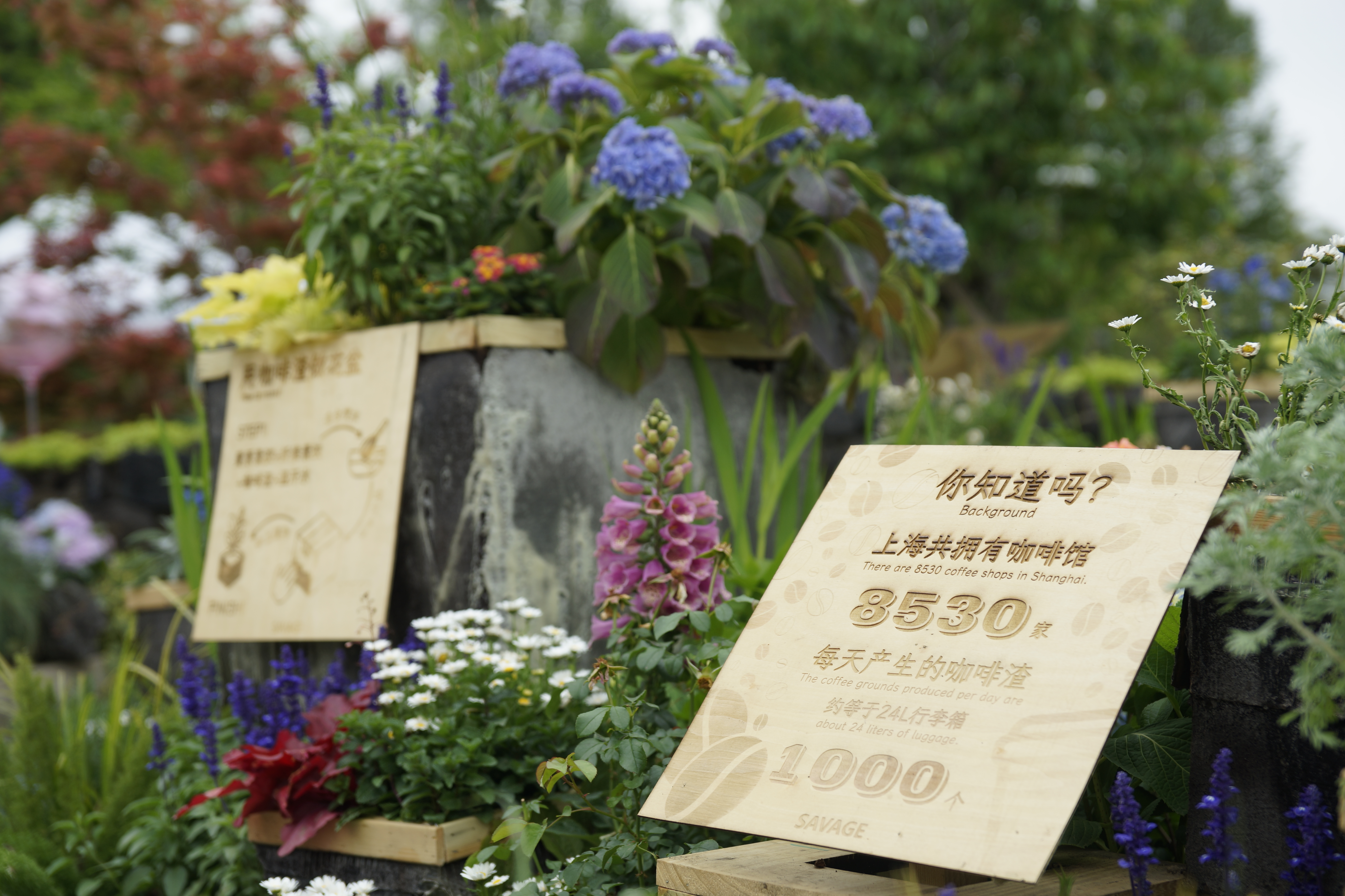 本届奉贤区全域花展以“容器花园”为命题,开展第二届“大学生花园节”活动,鼓励上海高校新生代创意力量参与园林、园艺创意实践。华东理工大学艺术学院7名景观设计系同学组成的savage(野人)设计团队,在林轶南、冯璐两位老师的指导下,呼应“容器花园”的主题,从“可持续”角度出发,选择以咖啡渣为主要原材料制作容器,打造既美观又绿色环保的“渣渣花园”。