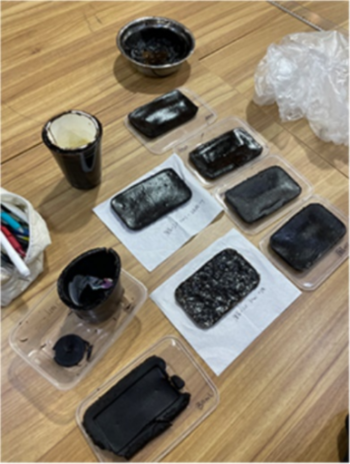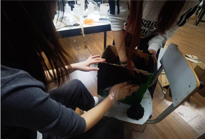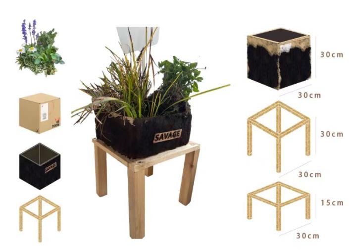 如何将咖啡渣变成可用的花园容器,成为设计中的一大难题。团队通过查阅资料发现,甘油和吉利丁与咖啡渣混合,能够形成较为坚硬的质地,然而实验结果无法达到预期效果。再次广泛查阅各类相关论文后,团队转而使用黄原素胶和纤维素胶(常见食品添加剂)进行咖啡渣粘合剂的制作。经过多次材料实验,选取不同的材料与配比,最终形成了现在以纸箱为骨架,以咖啡渣为表皮的“渣渣”容器。