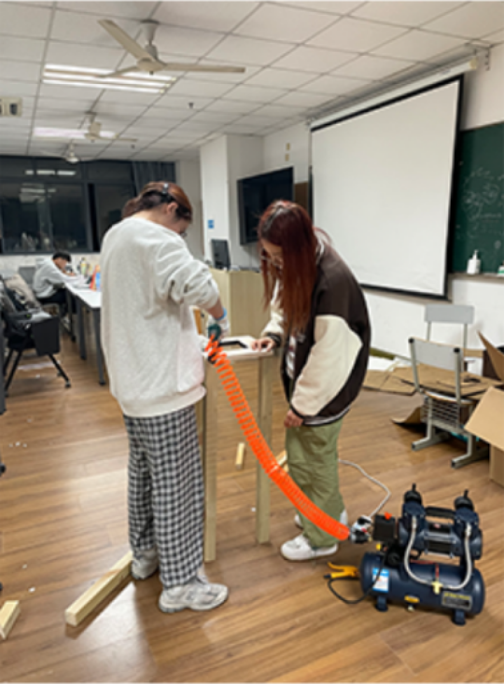 解决了容器的问题后,就进入了场地设计阶段。学生们开始思考如何将容器与场地进行融合:利用容易获取的木方进行支架制作,手工切割拼接,作为容器底座。同时,利用景观系先进的激光雕刻机,进行展示牌的制作,自然的木头焦化纹理为花园又增添了一番色彩。值得一提的是,场地所有容器和架子均为学生们利用专业工具手工制作完成,展现出高超的动手能力。