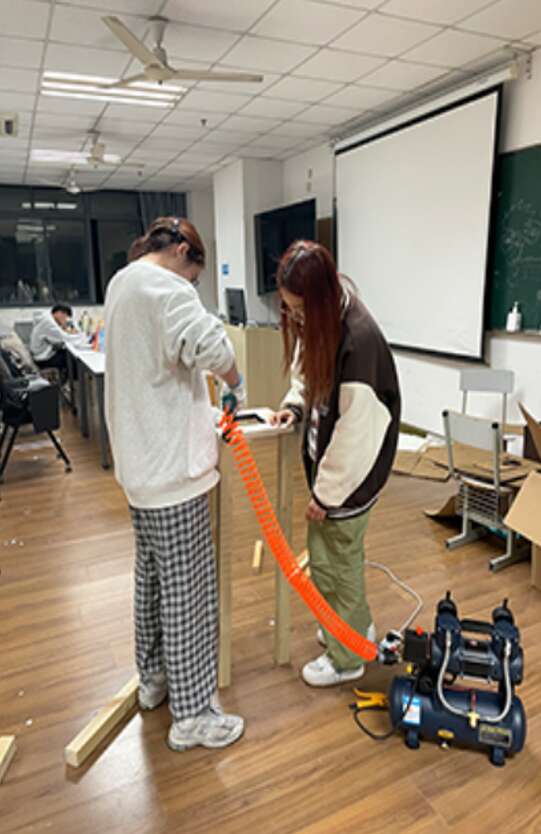 场地设计阶段,同学们把重点放在“将容器与场地进行融合”上。他们利用容易获取的木方进行支架制作,手工切割拼接,作为容器底座。同时,利用景观系已有的激光雕刻机,进行展示牌制作,自然的木头焦化纹理,为花园又增添了一抹色彩。场地内所有容器和架子,均为同学们利用专业工具手工制作完成。