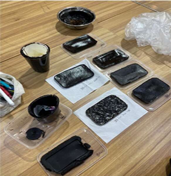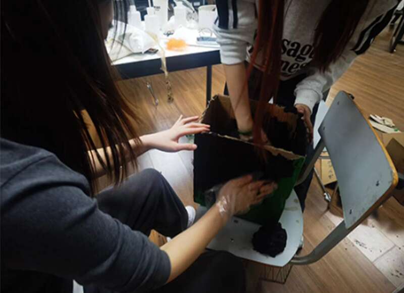 团队通过查阅资料发现,甘油和吉利丁与咖啡渣混合,能够形成较为坚硬的质地,然而实验结果无法达到预期效果。经过多次材料实验,选取不同的材料与配比,最终形成了现在以纸箱为骨架、以咖啡渣为表皮的“渣渣”容器。