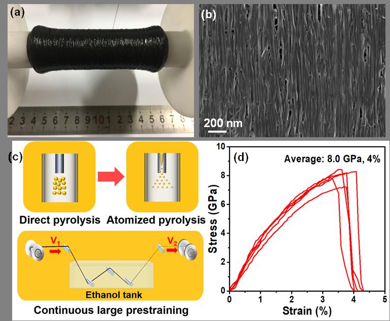 针对上述问题,王健农教授课题组创新地采用雾化催化热解法制备碳纳米管纤维。该方法有效改善了催化剂的催化效率,使制备的碳纳米管纤维具有较高的纯度。在此基础上,对碳纳米管纤维进行连续的预拉伸和辊压处理,极大地提高了碳纳米管纤维的取向性和致密性,最终,制备的碳纳米管纤维具有高强度(8.0 GPa)、高杨氏模量(350 GPa)和高延伸率(4%)的优异性能。该抗拉强度领先于所有人造宏观纤维的强度值,为高性能碳纳米管宏观材料的开发提供了一种新的策略,将在航空航天和新能源等领域具有重大应用。