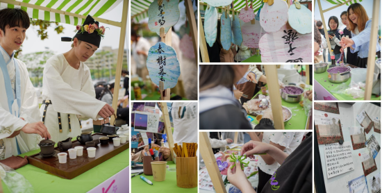 据介绍,市集持续开展两天,共设有18个摊位,分为春华探秘园(体验区)、春韵匠心坊(手作区)、春味食光集(美食区)3个区域。当天下午,随着“开市锣”的敲响,风檐广场瞬间热闹起来,各个摊位前聚集了一大批同学。在“清远茶香”品茶、在“摇风阁”制作漆扇、在“百草春”制作香囊、在“博格棋铺”对弈,更有色香味俱全的“花栗食社”现制糕点、“曦酒家”现调美酒…… 琳琅满目的摊位和舞台表演让人目不暇接,现场气氛十分热烈。