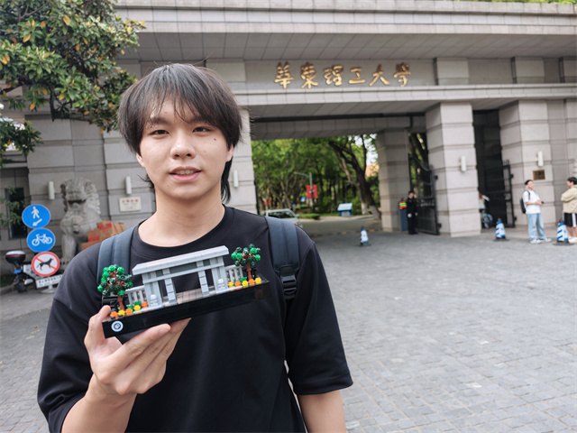 作为一名资深“乐高粉”和摄影发烧友,在初入华理的三天内,侯觉便迫不及待地成为一名背着相机的“暴走族”,建筑成为他观察的重中之重。不仅观察外观,还在细节上反复琢磨。这份对于建筑的热爱,让他在参加校名纪念品大赛时,选择用“搭建”模型的方式将自己熟悉的华理建筑还原并定格。