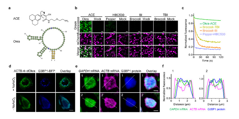 针对上述技术挑战,研究团队创新发展了具有高亮度和高稳定性的新型绿色荧光RNA,称为Okra505。Okra505由Okra RNA适配体和新型荧光团分子ACE构成,Okra可以以纳摩尔级的高亲和力结合ACE,并显著激活其产生明亮的绿色荧光。Okra505具有低Mg2+依赖性、高温度稳定性、高pH耐受性、不含有G-四链体等优点。进一步研究结果表明,Okra505在活细胞成像亮度以及光稳定性方面相较于前人报道的绿色荧光RNA提升了1-2个数量级,可实现细菌和哺乳动物细胞内低丰度mRNA的高亮度和低背景成像。受益于高亮度和高光稳定性的优点,Okra505可以被用于实时监测哺乳动物细胞内应激颗粒(Stress granules,SGs)的形成以及解聚过程,以及探究ATP能量分子对应激颗粒动力学过程的影响。通过与Pepper620联合实用,Okra505还可被用于应激颗粒内不同mRNA分布的结构光照明超分辨成像(SIM),揭示了不同mRNA在颗粒中分布的异质性和不均一性。