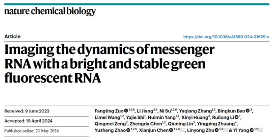 近日,我校药学院、生物反应器工程国家重点实验室、光遗传学与合成生物学交叉学科研究中心杨弋、朱麟勇、陈显军教授组成的研究团队在活细胞RNA成像技术研究中取得突破性进展,在国际著名学术期刊《自然—化学生物学》(Nature Chemical Biology)以长篇论文(article)形式在线发表题为“Imaging the dynamics of messenger RNA with abright and stable green fluorescent RNA”的研究论文。