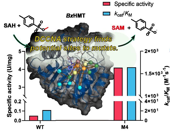 图片说明:利用动态互相关网络分析策略指导卤代甲基转移酶BxHMT的改造工作,显著提高了其针对非天然底物对甲苯磺酸甲酯的性能