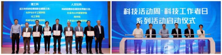 会上,蒋传海、轩福贞为化学与分子工程学院、化工学院、机械与动力工程学院、信息科学与工程学院以及社会与公共管理学院、商学院、艺术设计与传媒学院等2021~2023年科研经费优秀单位颁奖。正值全国科技活动周和第八个“全国科技工作者日”到来之际,蒋传海、轩福贞、阮力、屈炜、俞林伟、厉蕾共同启动科技周和科技工作者日系列活动。阮力、屈炜、俞林伟、厉蕾、金政伟为国家流程制造智能调控技术创新中心,化学品安全、绿色化工与工业催化、工业控制技术、煤液化气化及高效低碳利用全国重点实验室等新建国家级平台授牌。沈海涛宣读“十四五”以来科技人才项目名单。王慧锋、阎海峰为创新型智库团队代表颁发证书。