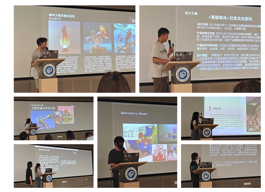 在实操环节,特赞专家团队从基础原理、基础操作、高阶应用等方面介绍了关于生成式人工智能的相关工具和方法,并通过实践指导学生如何用AI赋能红色文创设计。随后,50余位来自艺术设计与传媒学院、信息科学与工程学院的本科生及研究生在此基础上分组开展了红色文创设计创作实践,并进行了汇报展示。