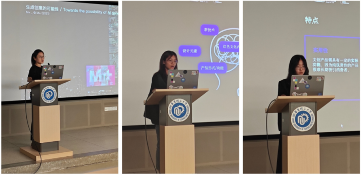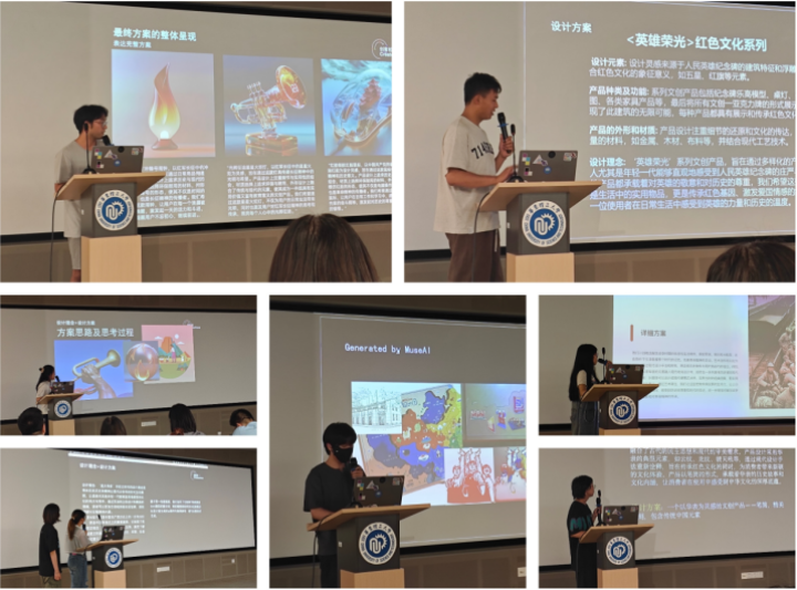 在工作坊环节,特赞专家团队从基础原理、基础操作、高阶应用等方面介绍了关于生成式人工智能的相关工具和方法,并通过实践,指导大家如何用AI赋能红色文创设计。随后,50余位来自艺术设计与传媒学院、信息科学与工程学院的本科生及研究生在此基础上分组开展了红色文创设计创作实践,并进行了汇报展示。