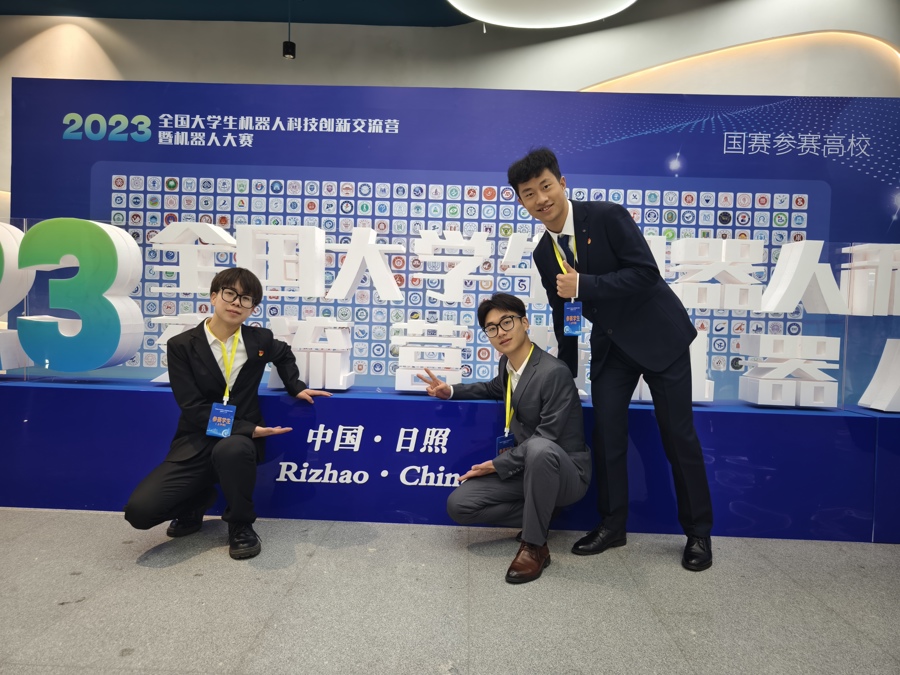 贾渭东(左一)和队员参加全国大学生机器人科技创新交流营暨机器人大赛决赛。