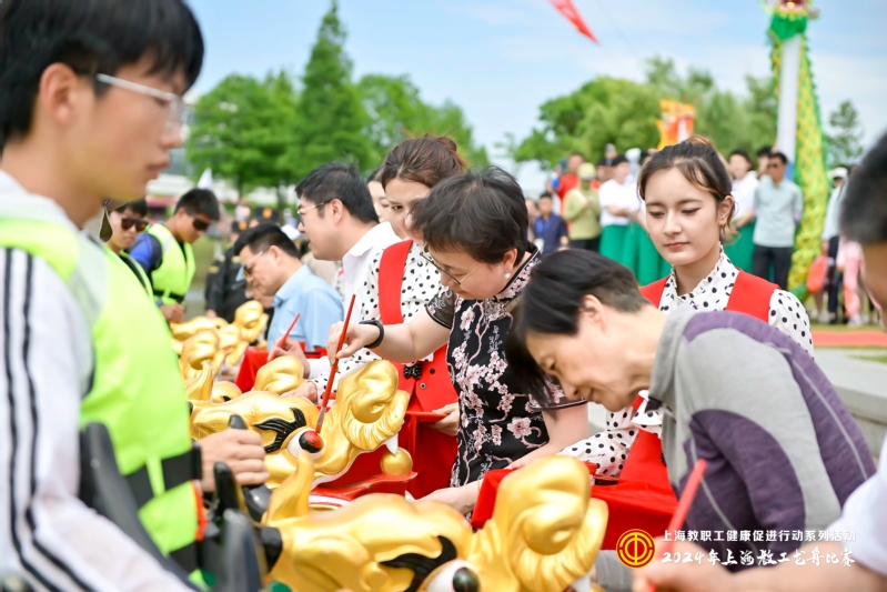 黄爱梅、刘晓僮分别作为运动员代表和裁判员代表宣誓,与会领导、嘉宾一同为龙舟点睛,张艳萍宣布2024年上海教工龙舟赛正式开赛。