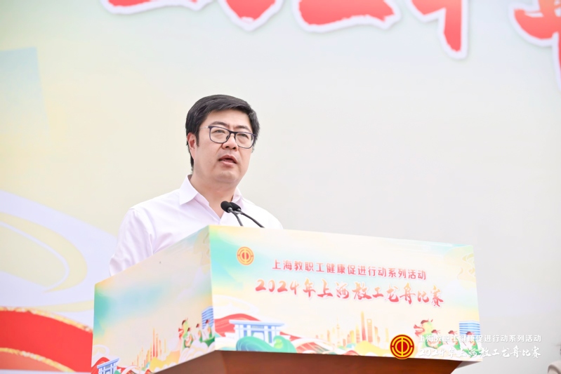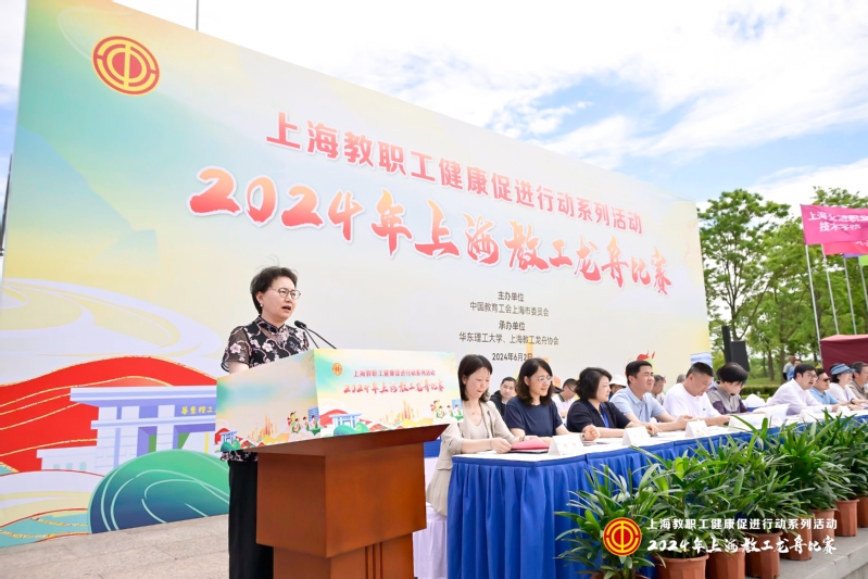 张艳萍代表上海市教育工会致开幕辞。她首先代表上海市教育工会向出席本场比赛的各参赛队伍表示热烈欢迎,对精心筹备组织本场龙舟赛的华东理工大学表示衷心感谢。她谈到,教职工是教育事业的中流砥柱,健康的体魄是广大教职工投身工作、为教育事业贡献力量的坚实基础。本场比赛不仅仅是竞技,更是倡导健康生活理念、促进教职工团结协作的重要举措。希望上海教职工能够通过本场比赛提振精神,传承中华民族团结拼搏、坚韧不拔的民族品格,发扬挑战自我、团结协作的文化精神,展现风采和活力,锻炼强健体魄,收获愉悦心情,以更加饱满的精神状态共同助力上海市教育事业高质量发展!