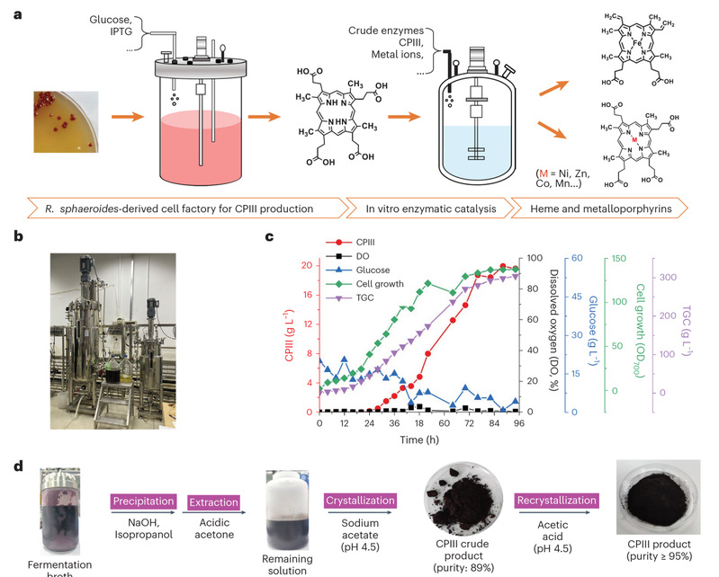 本研究创造性地利用光合细菌Rhodobactersphaeroides作为底盘微生物,构建高效细胞工厂,并通过偶联酶催化生产卟啉化合物的策略。首先,基于CRISPRi的关键基因筛选和调控双组分系统prrAB磷酸化水平的方法,结合分批补料发酵,在5L反应器中使目标卟啉中间体CPIII的产量达到16.5 g/L;随后设计开发了基于CRISPR/Cas12a的高通量酶筛选平台获得高效的酶催化元件,实现了CPIII的高效酶促转化,合成了各种金属卟啉,包括具有抗肿瘤活性的Zn-CPIII和具有多种功能和用途的血红素。本研究还进一步在200L反应器中实现CPIII的中试放大,并建立了基于重结晶的CPIII纯化工艺,产物纯度超过95%,回收率接近90%。在5L反应器中通过酶催化放大合成血红素和锌卟啉,产量分别达到10.8 g/L和21.3 g/L,均为迄今报道的最高生产水平。技术经济分析(Techno-economic Analysis)表明,大规模生产CPIII和血红素具有显著的成本和制造优势。这项研究提供了高效合成卟啉类产物的解决方案,为大规模生产血红素和其他具有重要工业和医学应用的有价值的卟啉提供了全新的路线,有望重塑卟啉制造工业。