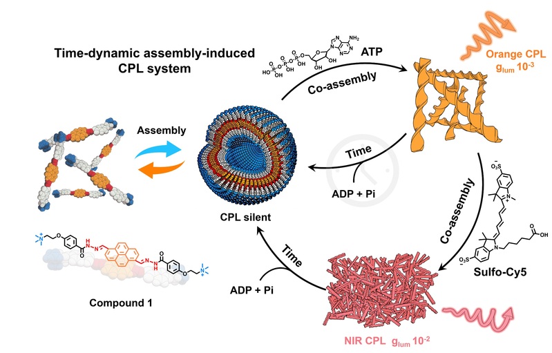 随着超分子科学的发展,具有深度时空动态性的非平衡态超分子组装体不断涌现。通过在时空维度调控分子组装行为,人们已经成功构建出瞬态超分子聚合物、凝胶材料、纳米材料等多种非平衡态组装材料,实现对材料结构及性能在时空维度的精准调控,为下一代智能材料的开发作出了重要的贡献。然而,构建非平衡态手性超分子组装体,实现近红外圆偏振发光在时空维度的动态调控,仍然面临着巨大的挑战。
