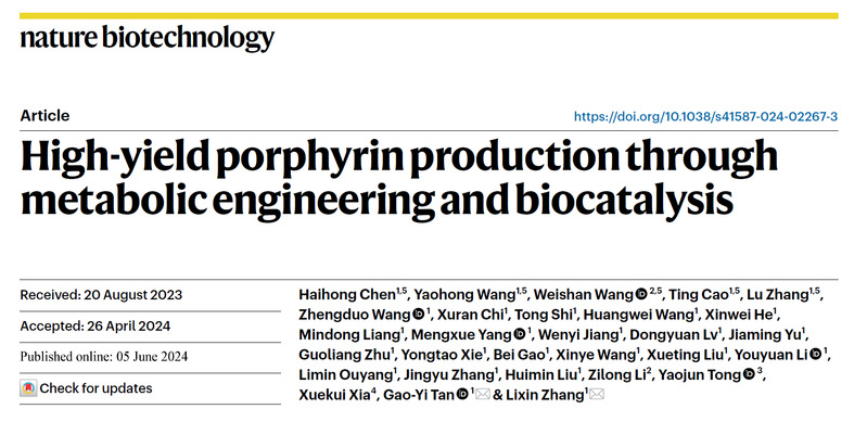 6月5日,生物技术领域国际顶级权威期刊《自然-生物技术》以长文在线报道了华东理工大学生物反应器工程国家重点实验室张立新/谭高翼团队在血红素及卟啉化合物高效生物制造方向上的突破性进展。研究论文题目为“代谢工程结合生物催化实现卟啉高效合成”。这项研究标志着华东理工大学在卟啉类产品的高效生物制造方面已达到国际领先并具备产业化的水平,未来或将变革或重塑整个卟啉制造工业。