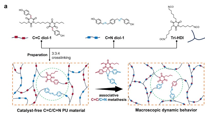 热固性塑料因其优异的尺寸稳定性、耐溶剂性和力学强度而备受重视。然而,稳定的永久交联网络也使其难以再加工与回收,导致严重的环境污染与资源浪费。将动态共价键引入到热固性聚合物网络中构筑共价自适应网络(Covalent adaptable networks, CANs),通过其在特定刺激(如温度、光和pH值)下的可逆键交换驱动网络骨架链段进行重排,能够赋予热固材料可塑性,以及自修复、可回收、形状记忆等动态特性。绝大多数共价自适应网络材料需要催化剂以引发或加速动态键交换,然而,在大宗聚合材料中使用催化剂,往往需要高昂的成本,同时,小分子催化剂在长时间的使用后容易析出,导致材料动态性的损失且对环境产生潜在毒害作用。因此,如何开发无催化剂的共价自适应网络材料是领域亟待解决的关键科学问题。