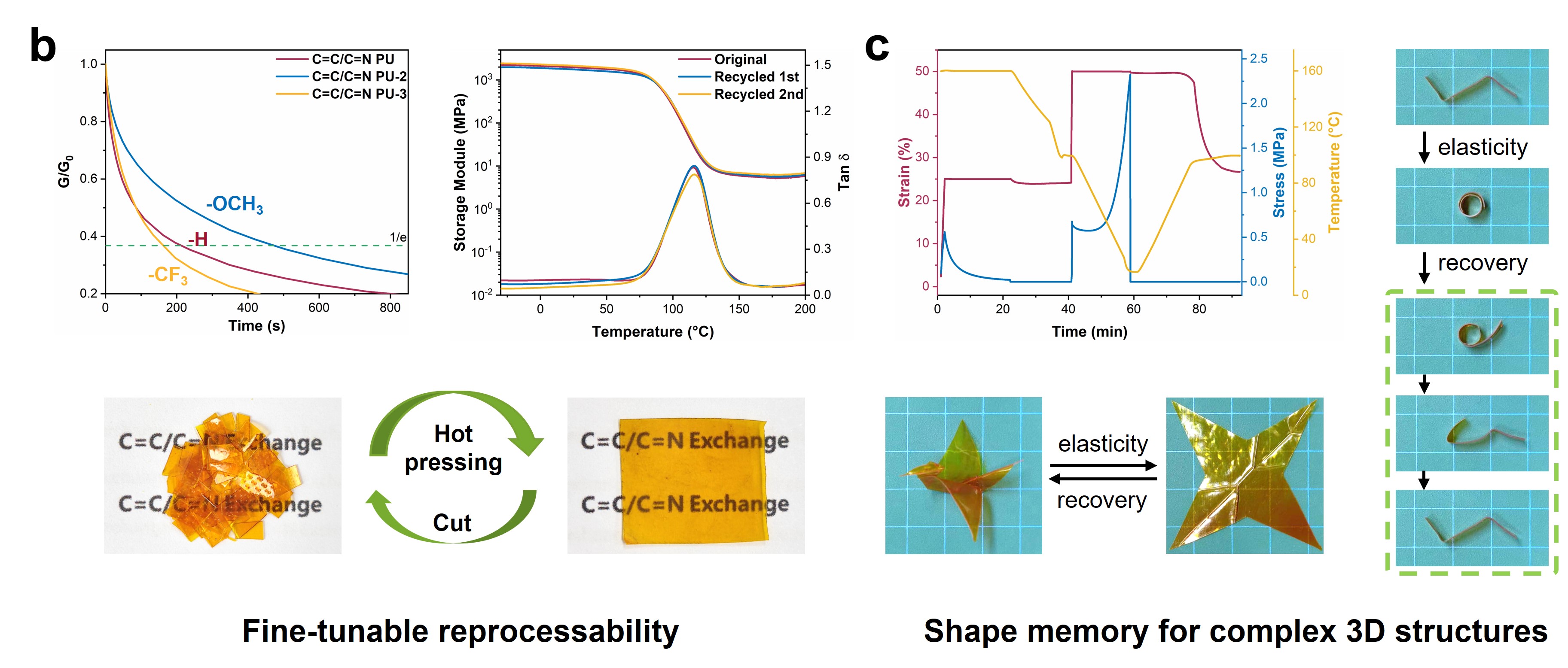 C=C/C=N交换反应赋予该材料显著的网络重构能力,在相同温度下,其特征应力松弛时间仅为C=N PU对照组的1/20左右。因此,这类材料可以通过热压进行多次回收再加工,同时保持其化学完整性、热性能和机械性能。进一步,研究人员发现通过改变动态键邻位的取代基,可以对材料应力松弛速度(吸电子基加快、推电子基减慢)进行高效调控。最后,研究人员探索了这类材料的形状记忆功能,将其在高温段(~150 ℃)进行快速键交换以重构其3D永久网络,从而具备复杂的初始几何形状;在中温段(~90 ℃)达到玻璃化转变温度后进行链段运动,从而获得弹性以编辑其临时形状;快速降至室温固定临时形状后重新升温(如浸入热水)则可引发快速形状记忆(< 3 s)过程。综上所述,本工作首次将C=C/C=N交换反应应用于聚合网络,构筑了一类无催化剂、可再加工、可形状记忆且具备优异机械性能的共价自适应网络智能材料,为无催化剂CANs智能材料的发展提供了新的思路。