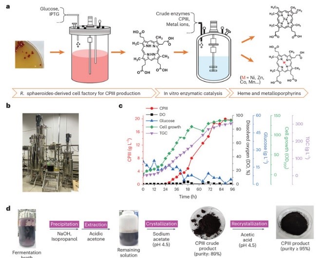 进一步地,研究团队在200L反应器中实现了CPIII的中试放大,并建立了基于重结晶的CPIII纯化工艺,产物纯度超过95%,回收率接近90%。此外,在5L反应器中通过酶催化放大合成血红素和锌卟啉,产量均为迄今报道的最高生产水平。值得一提的是,研究团队首次将CRISPR/Cas12a用于酶的高通量筛选,获得了高活性的脱羧酶,进而实现了血红素的高效合成。