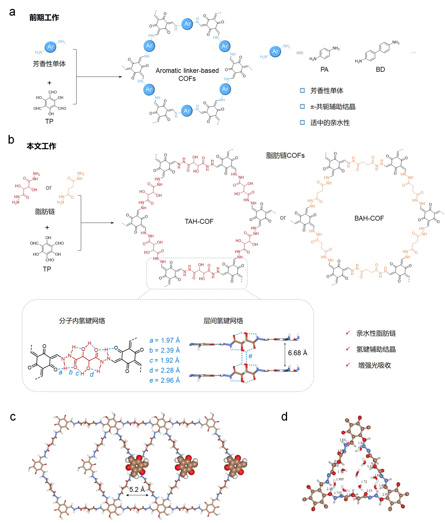 过氧化氢(H2O2)是高价值的工业化学品,广泛应用于纸浆漂白、废水处理、消毒和化学合成,以阳光、水为原料制H2O2的人工光合成具有反应温和、操作简单和无二次污染等优点。COF是一类新兴的有机光电半导体。然而,大多数COF是由芳环连接单元构建,其骨架疏水性极大限制了在水中光催化的反应效率。