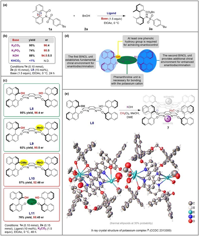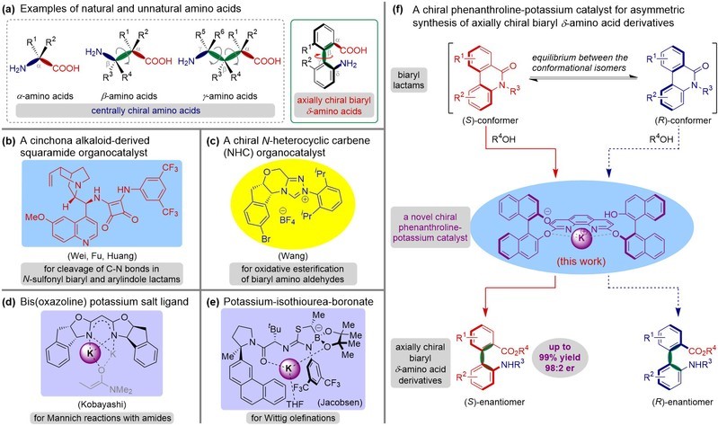 张志鹏教授团队以不对称催化和手性分子的合成为主要研究方向,长期致力于新型原创性手性催化剂的设计、发展和应用研究。为了发展非天然联芳基轴手性氨基酸不对称催化合成的新方法,该团队设计合成了一种新型的轴手性菲罗啉钾络合物,利用该络合物作为催化剂实现了联芳基内酰胺类化合物的醇解动态动力学拆分,高对映选择性地合成了一系列联芳基轴手性氨基酸衍生物。该工作不仅为非天然轴手性氨基酸的合成提供了一种有效的方法,也为手性钾络合物催化剂的设计发展提供了参考。