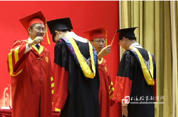 在学位授予仪式上,校领导与学院领导共同为2024届毕业生拨穗正冠,并向毕业生赠送毕业纪念卷轴。