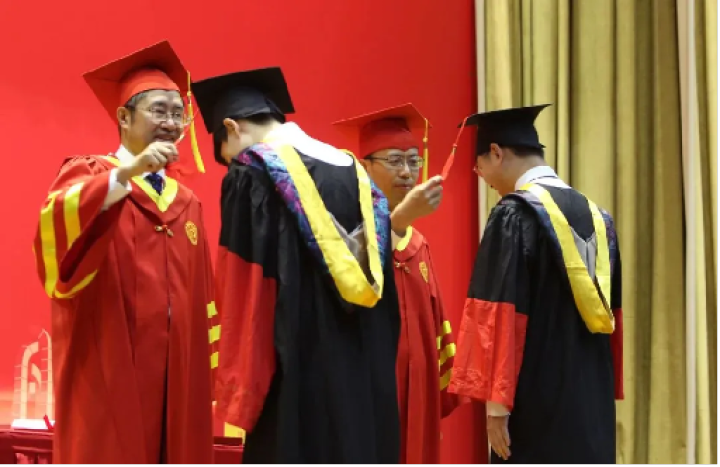 在学位授予仪式上,校领导与学院领导共同为2024届毕业生拨穗正冠,并向毕业生赠送毕业纪念卷轴。