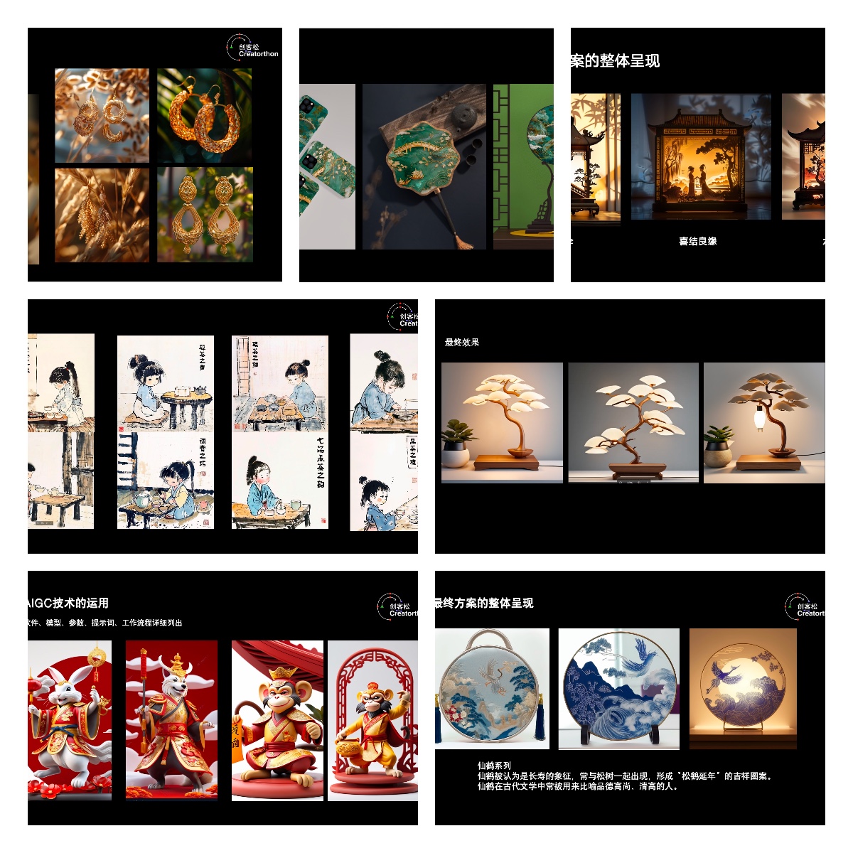 在学习了解大语言学习模型在设计创意领域的应用、人工智能图像生成原理及策略的基础上,50余位来自不同院校的学生分组展开了江南文化文创设计创作实践,并进行了汇报展示。