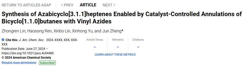 近日,华东理工大学药学院郑军课题组在国际权威学术期刊《美国化学会志》上发表研究论文,报道了课题组在催化剂调控双环[1.1.0]丁烷与α-烯基叠氮化物环化反应合成氮杂双环[3.1.1]庚烯的最新进展。