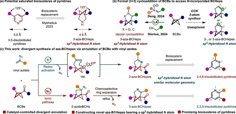 最近,邓卫平课题组和Glorius课题组分别报道了两例Lewis酸催化的双环[1.1.0]丁烷 (BCBs) 参与的 (3 + 3) 偶极环加成反应,构建了一系列含有sp3杂化氮原子的3-氮杂[3.1.1]庚烷化合物(图1b)。由于吡啶结构中的sp2杂化氮原子含有非共轭的孤对电子,以及C=N双键上具有π电子,这些结构特征影响着碱性以及与目标蛋白分子之间的结合能力,氮原子的杂化态是探索吡啶的生物电子等排体的重要考量。从这些方面考虑,含有sp2杂化氮原子的双环[3.1.1]庚烯结构 (aza-BCHepes) 可以更好地模拟吡啶。然而由于结构的刚性以及亚胺的稳定性等因素,合成含有sp2杂化氮原子的氮杂[3.1.1]庚烯骨架是具有挑战的,目前尚无这类结构的合成报道。因此,开发高效的催化策略以快速地获得新型氮杂双环[3.1.1]庚烯骨架在药物创新中具有重要应用价值。