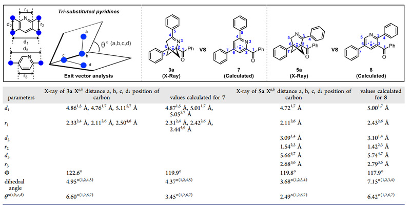 随后,作者对2-和3-氮杂[3.1.1]庚烯 (3a和5a) 的几何结构以及稳定性等进行了相关研究,结果显示:1)3a和5a在碱性条件下均具有较好的化学稳定性,在1 M氢氧化钠水溶液中放置一天均不会分解;3a在酸性条件下具有较好的化学稳定性,而5a在0.1 M盐酸水溶液中放置一天会有略微的分解。2)2-和3-氮杂[3.1.1]庚烯 (3a和5a) 的单晶结构以及几何参数与相应吡啶的理论计算结果非常相似。矢量分析表明:2-和3-氮杂[3.1.1]庚烯可以在空间结构上很好地模拟吡啶环,是三取代吡啶有潜力的三维生物电子等排体(图3)。