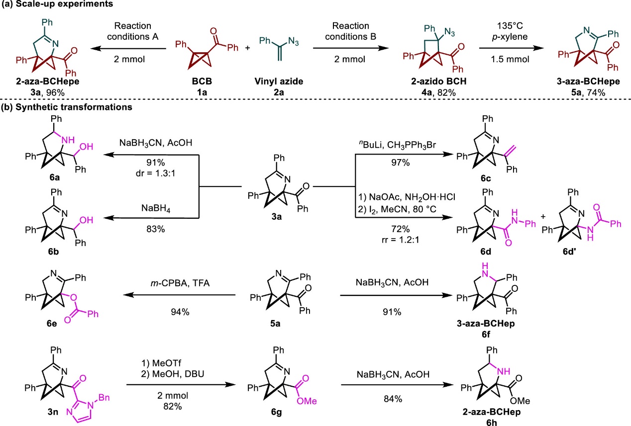 郑军课题组在前期的工作中,已发展了一类Ti(salen) 催化的BCBs和氮杂二烯的环加成反应,高效地构建了2-氨基双环[2.1.1]己烷,为苯胺的生物电子等排体提供了新的研究思路 (Org.Lett. 2024, 26, 1745−1750)。在此基础上,郑军课题组最新报道了催化剂控制的双环[1.1.0]丁烷 (BCBs) 与α-烯叠氮化物的环化反应,发散性地合成了2-和3-氮杂双环[3.1.1]庚烯 (aza-BCHepes)。该研究从简单易得的α-烯基叠氮化物和BCBs出发,采用催化剂调控的 (3 + 3) 和 (3 + 2) 环化反应策略,开发了一种构建全新的2-和3-氮杂[3.1.1]庚烯结构的实用方法。相关成果发表于《美国化学会志》(图1c)。