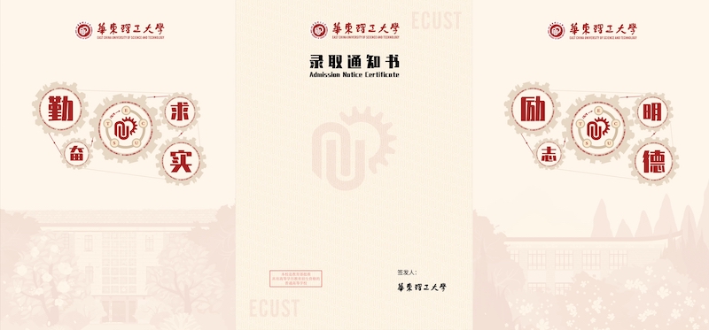 通知书的封面设计引用华理特色的齿轮元素,外形融入华理特色建筑,内圈采用“华东理工大学”二进制编码,环绕着华理英文缩写及校徽。随着时间齿轮的转动,同学们将在2024年与华理相遇。该元素作为关键线索,贯穿通知书整体。