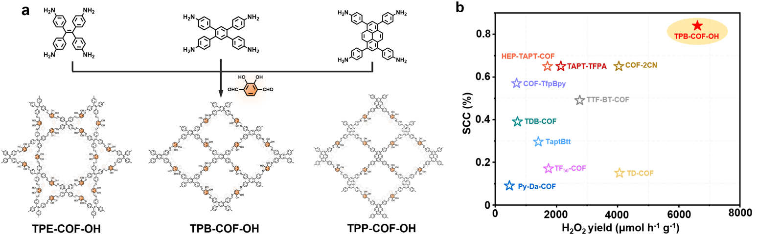 其中一项工作中,研究团队将邻苯二酚氧化还原活性基团引入到共价有机框架(COFs)中,通过邻苯二酚与邻苯醌发生可逆互变的方式,将电子自发的传递给氧气,有效抑制了光催化过程中的电荷复合,并降低了H2O2产生过程中的能垒。研究结果表明,基于四苯基苯和邻苯二酚缩合构建的TPB-COF-OH可以在纯水和空气中光催化全合成H2O2,生成速率为6608 μmol h–1g–1,太阳能到化学能的转换效率(SCC)高达0.84%,是目前COFs类光催化剂在太阳能驱动的H2O2生产中的最高值之一。