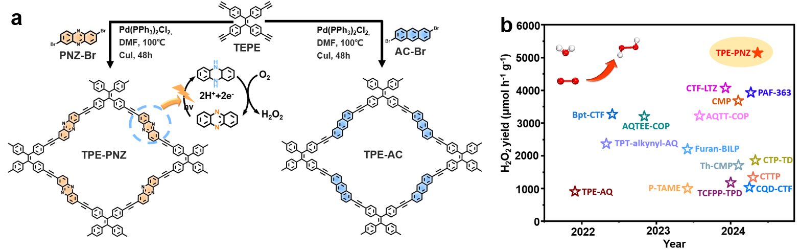 另一项工作中,研究团队将吩嗪氧化还原活性单元引入到共轭微孔聚合物(CMPs)中,设计并合成了一系列具有高效光催化活性的聚合物。其中基于四苯乙烯和吩嗪偶联构建的TPE-PNZ光催化合成H2O2的速率为5142 μmol h–1g–1,SCC达到0.58%,是CMPs类光催化剂产H2O2的最高值之一。进一步研究发现,吩嗪与二氢吩嗪的可逆互变可以有效促进聚合物的电荷分离,同时有效促进O2的吸附和还原过程,实现了光催化剂高效率绿色合成H2O2。这项研究为可持续能源研究的先进材料设计提供了新见解。