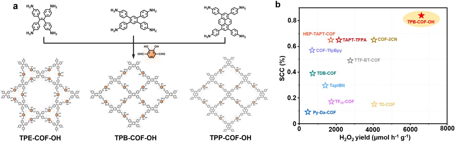 自然界的生化反应中常利用有机氧化还原活性基团的可逆反应用于电荷传输,抑制了电荷的复合。受到这些反应的启发,花建丽教授团队将邻苯二酚氧化还原活性基团引入到COFs中(图1a),以形成新的化学键的方式储存电子并进行传输,有效地抑制了光催化过程中的电荷复合,并降低了H2O2产生过程中的能垒。得益于高电子传输效率和低光催化产H2O2能垒的理想结合,TPB-COF-OH可以在纯水和空气中光催化全合成H2O2,生成速率达到了6608 μmol h–1g–1,太阳能到化学能的转换效率高达0.84%,是目前COFs类光催化剂的最高值之一(图1b)。