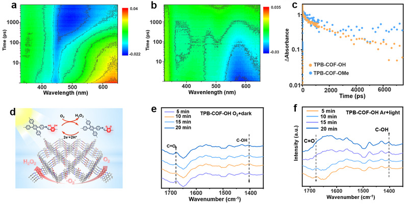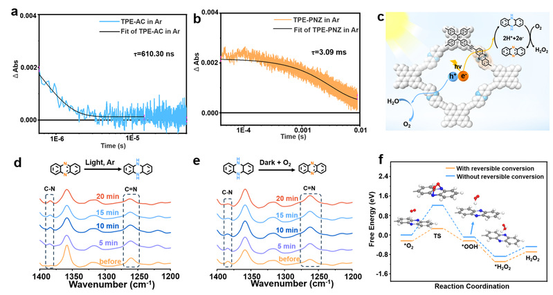 图2a~c的瞬态吸收表明TPB-COF-OH的激发态寿命相对于其分子参比化合物TPB-COF-OMe更短,TPB-COF-OH对O2表现出更强的相互作用,有利于其光生电子到O2的转移,促进电荷分离。图2d~f的原位漫反射傅里叶变换红外光谱表明,在暗态和O2的氛围下邻苯二酚可以自发地转化为邻苯醌,而光照和Ar的氛围下,邻苯醌则可以被光还原回到邻苯二酚。直观的证实了TPB-COF-OH产H2O2过程伴随着邻苯二酚与邻苯醌的可逆转化。实验和第一性原理计算表明邻苯二酚活性位点的反应活性受到分子工程的调控,且邻苯二酚与邻苯醌的可逆互变有效地降低了其反应过程中的能垒。该成果发表于《美国化学会催化》。