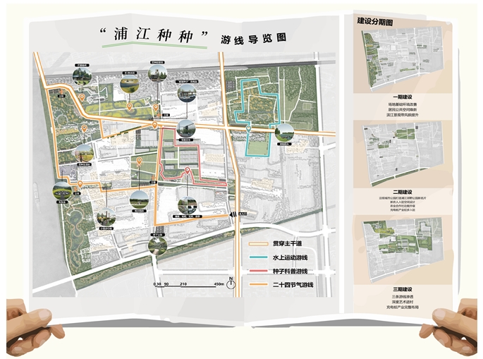 而“浦江种种”小组的规划方案以根植于乡土的“种子”为切入点,单字“种”呼应种子,“种种”又是浦江镇现状资源和浦江人民共同书写故事的总和,导出“浦江种种”的主题。具体方案规划中,提出三大发展方向:艺术进村、产业孵化和幸福萌芽,旨在打造艺•教•居•游 四位一体新乡村,实现城市、乡村、自然的无缝衔接。空间规划为一岸,两轴、四环景观格局。为提升居民福祉,该组提出三大策略:产业升级拉动经济、用“渗透”替代“置换”,以及根据不同人群需求制定建设时间顺序,且优先考虑居民需求。