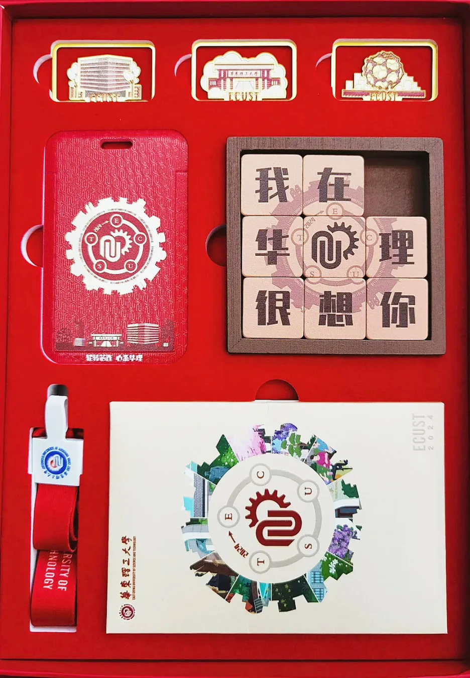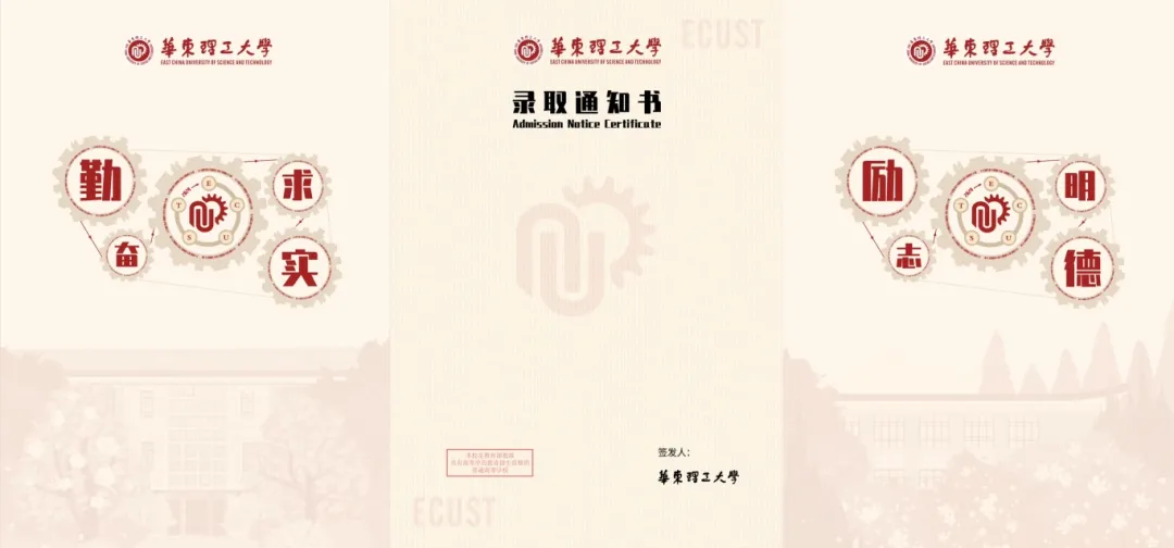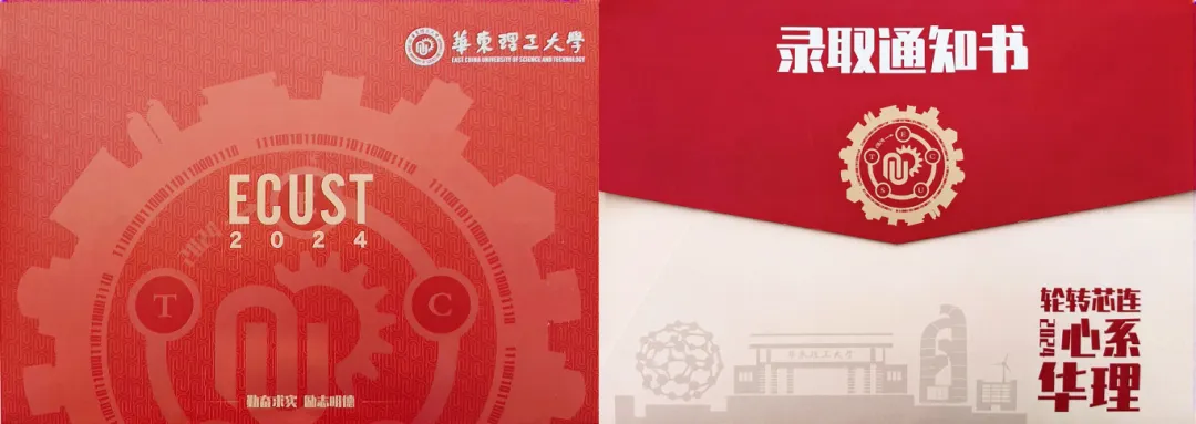 华东理工大学录取通知书以“轮转芯连,心系华理”为主题。通知书的封面设计引用华理特色的齿轮元素,外形融入华理特色建筑,内圈采用“华东理工大学”二进制编码,环绕着华理英文缩写及校徽。录取通知书礼盒中有华容道小游戏、黄铜书签、卡套、明信片等精致美观、实用悦目的文创周边,将陪伴同学们步入华理的学习生活。
