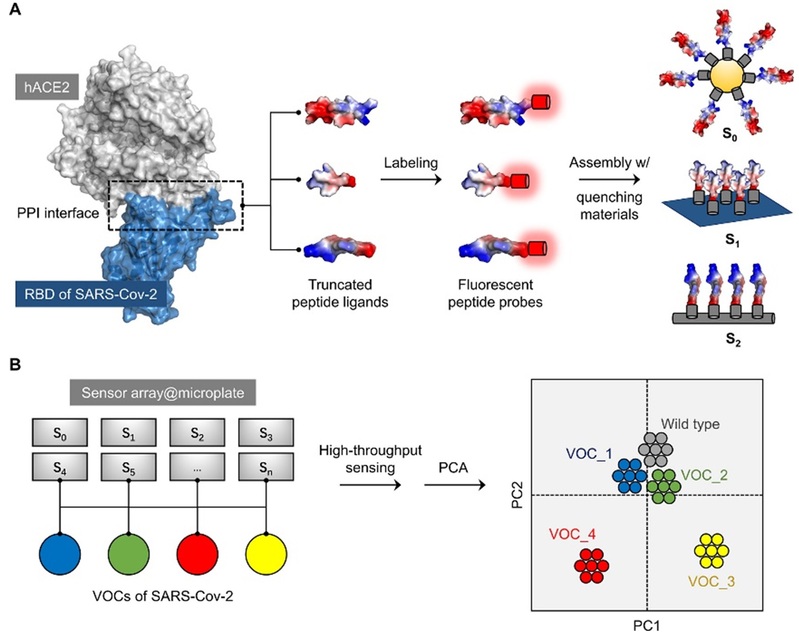 针对上述关键问题,贺晓鹏教授课题组基于前期对甲型流感病毒和耐甲氧西林金黄色葡萄球菌快速检测分型的工作基础,进一步发展了一种基于荧光多肽的传感阵列,准确实现了新冠病毒的突变体区分。研究人员通过对新冠病毒刺突蛋白受体结合域(RBD)与其经典人细胞受体hACE2相互作用的界面解析,从后者截短并剪接了多个结合多肽。经AlphaFold2模拟及圆二色谱分析,发现部分多肽保有本征螺旋结构。随后,通过荧光标签的引入及与多种具有荧光猝灭效应低维材料的超分子复合,构建了荧光可竞争激活的多肽传感阵列。最终经由荧光酶标仪高通量正交筛选及主成分分析,验证多肽阵列可在一株原始株存在下,有效区分包括Alpha、Beta、Delta、Gamma和Omicron在内,世界卫生组织(WHO)高度关切的5个新冠变异株(VOC),分析结果与病毒的系统发育树一致,并与病毒感染力高度关联;还通过表达不同VOC重组RBD验证了多肽系通过与RBD的竞争结合,引导了阵列体系不同程度的荧光呈现,随后对这些荧光特征信号集的降维分析实现了病毒精准分型。