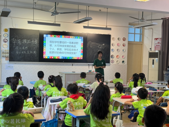量身定做的“生活物理课堂”、专属打造的乡土环保支教课程、有趣又有料的爱绿护绿活动、好玩又有效的学习形式……炎炎夏日里,华理开展了“万生进千村百企”社会实践活动,共派出近百名志愿者前往徐汇区、崇明区等办班点,他们化身“六边形老师”深入基层社区,积极参与缓解全市小学生暑期“看护难”问题,因地制宜开展各具特色的暑期社会实践活动,服务700余名孩子在探索科学与科技的过程中收获知识、友谊和成长,“托”起这“一夏”的美好。