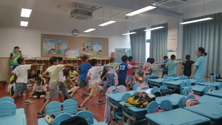 在正式上岗之前,爱心暑托班志愿服务队还参加了专题培训。面对5个班近200名小学生的看护服务,服务队分工明确、高度负责。在队长赖雨轩的组织带领下,全体队员每天上午7点上岗,下午6点结束,全身心协助相关老师讲课,包括音乐手势舞、歌曲《如愿》等音乐课程,啦啦操、体适能、小游戏等体育课程,以及折纸、无人机科普、垃圾分类、城管普法、申声传情等其他丰富课程,为小学生度过美好暑假保驾护航。