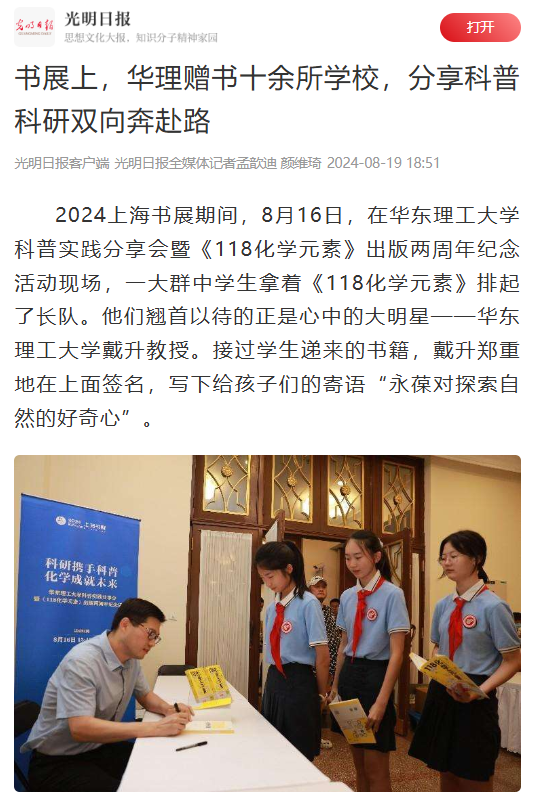 2024上海书展期间,8月16日,在华东理工大学科普实践分享会暨《118化学元素》出版两周年纪念活动现场,一大群中学生拿着《118化学元素》排起了长队。他们翘首以待的正是心中的大明星——华东理工大学戴升教授。接过学生递来的书籍,戴升郑重地在上面签名,写下给孩子们的寄语“永葆对探索自然的好奇心”。