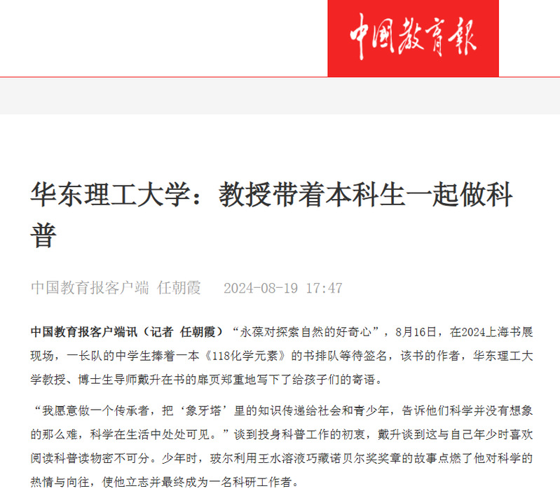 “当前国内科普图书市场中,不少畅销书都是引进版。”戴升调研后决定,要做原创科普图书,让孩子们感受到中国科学文化的魅力。于是,他带领学生开始创作针对中国青少年学情的科普书《118化学元素》,聚焦用元素重新认识万物,书中结合中国生活场景,对化学元素的性质、简介、应用、逸事等知识进行生动地讲解,并特别加入了“元素与中国”特色板块,着重介绍化学元素与中国历史、中国文化及中国制造方面的关联。