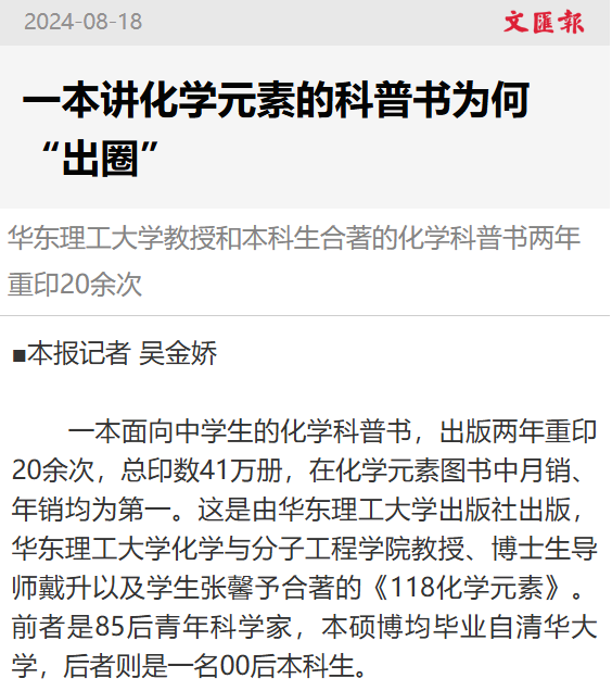 一本面向中学生的化学科普书,出版两年重印20余次,总印数41万册,在化学元素图书中月销、年销均为第一。这是由华东理工大学出版社出版,华东理工大学化学与分子工程学院教授、博士生导师戴升以及学生张馨予合著的《118化学元素》。前者是85后青年科学家,本硕博均毕业自清华大学,后者则是一名00后本科生。
