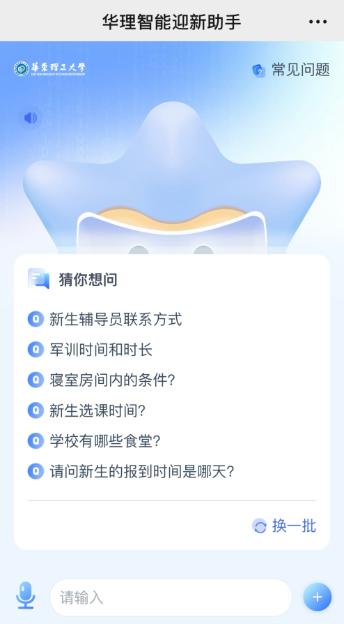 “学校有哪些食堂?”“新生什么时候选课?”“寝室的条件如何?”……本科新生只要关注“学在华理”公众号,从“迎新专栏”选择“华理智能迎新助手”,通过身份认证后即可提出疑问,旋即得到想要的答案。数智启航、一键直达大学新生活——“华理智能迎新助手”是华东理工大学今年重点推出的人工智能问答系统,它具有活泼可爱的虚拟形象,能迅速消除新生对学校的陌生感,更化身“贴身顾问”,覆盖交通信息、后勤保障、教学选课、学生事务、团学组织、学费缴纳等7大模块43类从报到入学到各类日常事务的150个迎新相关问题,为新生提供智能化入学体验。